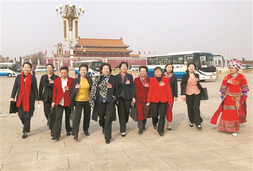 3月8日下午,十三届全国人大四次会议第二次全体会议在北京人民大会堂举行。这是湖南代表团部分女代表精神抖擞赴会。徐远冰 摄