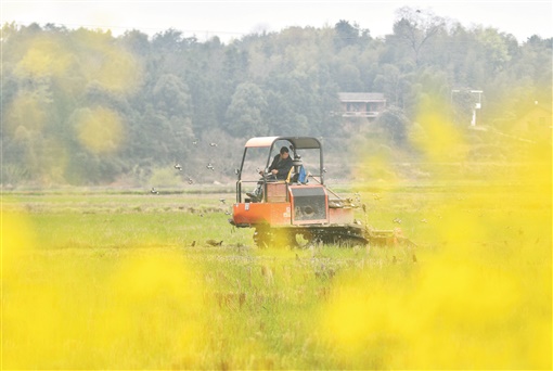 3月11日,双峰县井字镇生机村,农民驾驶农机耕整水田。今年,该县通过加大粮食生产奖补力度、严控耕地抛荒与“非农化”、开展集中育秧等多项措施,着力推进“单改双”,扩大双季稻生产面积。 李建新 摄