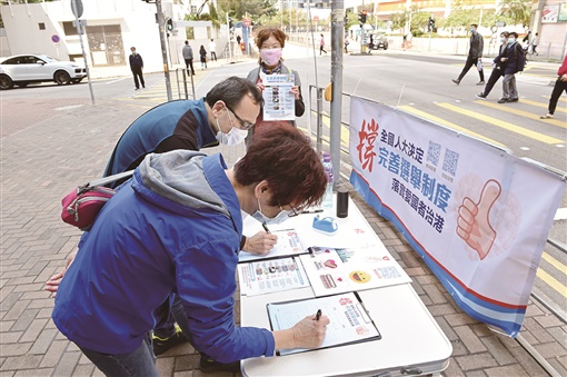 3月11日,在香港街头,香港市民签名支持全国人大完善香港选举制度决定。新华社发