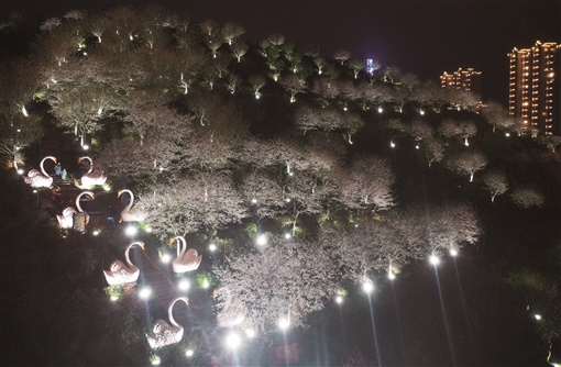 3月18日晚,长沙市岳麓区晚安文化园内,樱花树在灯光照耀下璀璨夺目。该文化园占地200多亩,种植有山樱花、关山樱、松月樱等二十多个品种的樱花。当前正值花季,漫山花开,美不胜收。该园特意在樱花开放期间夜晚开放灯光,吸引不少市民前来赏花观景。 湖南日报·新湖南客户端记者 田超 摄