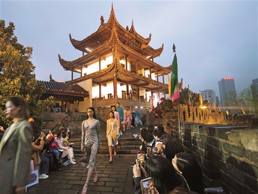 3月19日傍晚,长沙市天心阁,模特在古城墙上展示时尚潮流服饰。当天,由长沙市天心阁管理处、长沙王府井百货共同打造的2021长沙时装周首秀启幕。秀场上,先锋独立的走秀为城墙增添几抹新意,传统与时尚交相辉映,让在场观众大饱眼福。