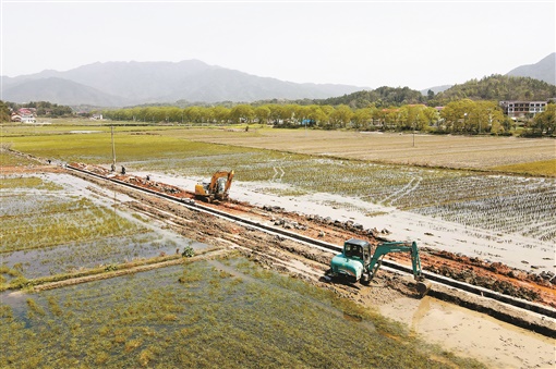 3月22日,双峰县井字镇白碧村高标准农田改造现场,施工人员抢抓晴好天气加紧施工。近年,该县为有效改善农田灌溉及耕作条件,促进农业可持续发展,积极推进高标准农田改造,把更多“望天田”建成“高产田”。李建新 摄