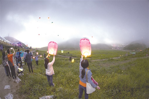二等奖:《天空中的祝福》——游客在龙山县八面山首届帐篷节放飞孔明灯。 曾祥辉 摄