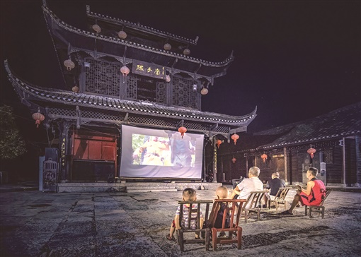 三等奖:《土家族摆手堂前放电影》——龙山县惹巴拉景区摆手堂前放抗日电影,土家族小朋友从小就受到爱国主义熏陶。吴仙华 摄