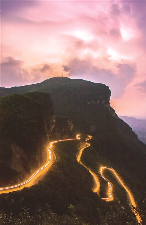 三等奖:《落霞与金龙共舞》——龙山县八面山的盘山公路。 胡荣春 摄