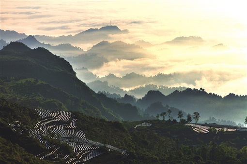 二等奖:《云海衬晨韵》——龙山县八面山下半坡村。 李永生 摄