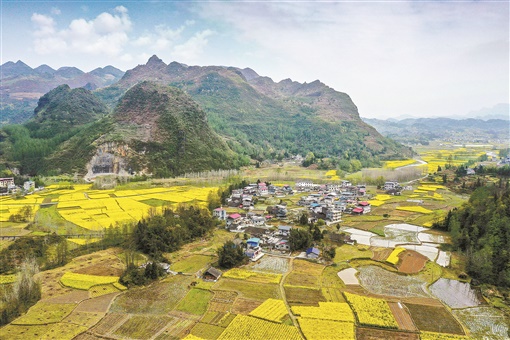 3月23日,龙山县召市镇方坡村,金黄色的油菜花与民居交相辉映,构成一幅美丽的春天画卷。曾祥辉 摄