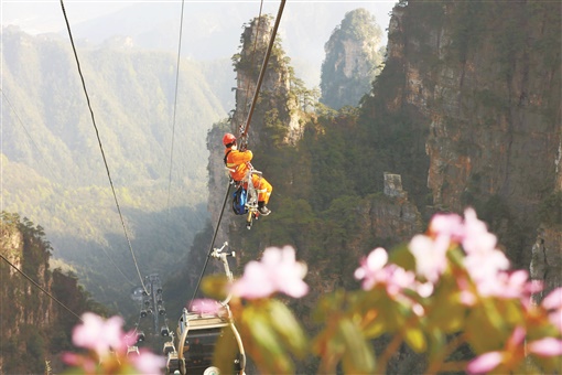 3月23日,张家界市武陵源区天子山景区,当地消防救援、景区管理等多个部门组织开展索道高空模拟救援演练,检验索道安全性能和各项应急救援措施,提高旅游安全应急救援能力。吴勇兵 摄