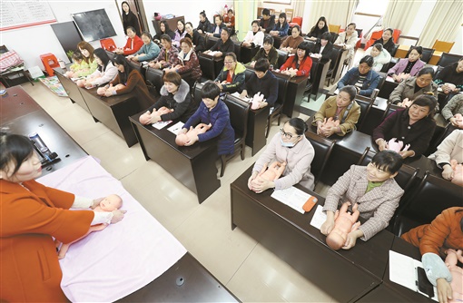 上图:3月23日,资兴市唐洞街道田心社区,学员在学习育婴技能。当天,资兴市“一户一产业工人”培养工程——育婴员技能提升培训班开班。此次培训以就业为导向,通过理论学习加实操练习,为50名报名者开展为期10天的育婴技能培训。李科 李铁南 摄影报道