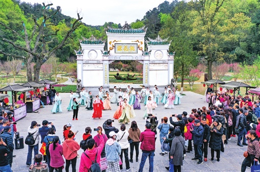 “旅游+民俗”,尽显地方风情。桃源石雕、桃源刺绣等民间手工艺展,擂茶习俗、常德米粉制作手艺等表演引得众多游客流连。游客品美食、赏民间手工艺、观古老戏法,将桃花源的浪漫一网打尽。