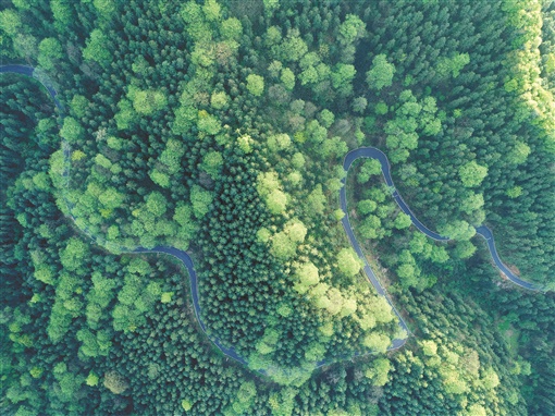 3月24日,安仁县熊峰山国家森林公园,蜿蜒的旅游公路与高山上的绿植交相辉映,形成如诗如画的美丽“飘带”。