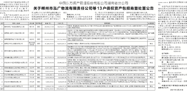 中国东方资产管理股份有限公司湖南省分公司 关于郴州市泓广物流有限责任公司等13户债权资产包招商暨处置公告