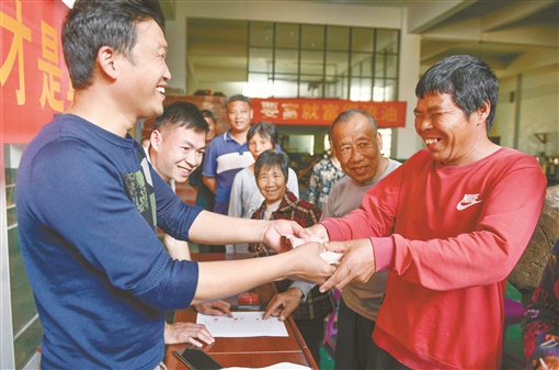 3月29日,道县祥霖铺镇八家村,农户高兴地从村干部手中领取分红款。当天,该村将发展油茶产业的第三批分红款110360元发放到16户农民手中。近年来,八家村通过“党建+合作社+农户”机制,引导农户以土地入股,以合作社形式发展新造油茶种植,促进农户增收。 蒋克青 摄