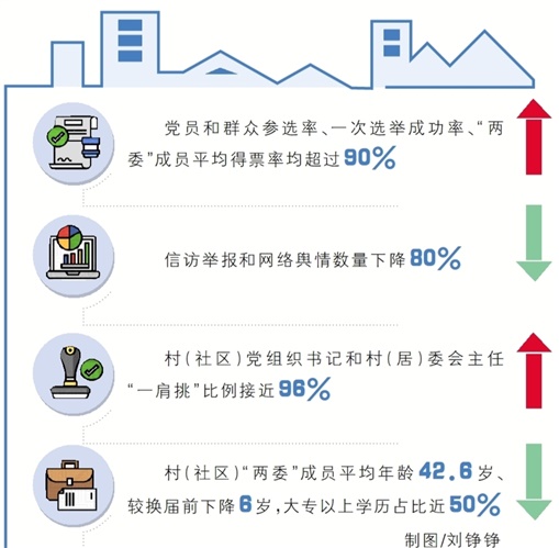 这次村(社区)换届从一开始,就把村(社区)配套组织建设与村(社区)“两委”换届同步谋划、通盘考虑、有序推进,村(社区)配套组织负责人均由“两委”成员依法依章担任或兼任,村级重大事项民主决策制度机制进一步健全,形成了“众星拱月”“月明星灿”的基层治理格局。