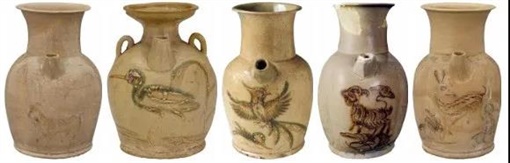 人物、花卉、鸟兽都鲜活地通过长沙窑展现在我们面前,它们被简洁的笔法写就,意趣生动,主要采用青釉绿褐彩绘,即底色为米褐色,用绿色,褐色绘制花卉,飞鸟,走兽,色彩活泼,充满春天鲜活的气息。笔法上则是全然的自由,粗笔和细笔根据不同的绘制需要随意的转换使用,并不过分刻画细节,与当时唐王朝主流的工笔审美形成显著的差异,显示出中国写意画的大胆尝试,并取得了可贵的成就。不仅如此,部分长沙窑上还出现了彩绘和诗文一同出现的装饰形式。这在彩绘瓷上,甚至是当时的中国画上都是罕见的。竹林七贤诗文罐,融绘画与诗文书法的装饰为一壶,显示出长沙窑彩绘无与伦比的创新精神。今天,我们还可以在湖南省博物馆、长沙简牍博物馆、长沙窑博物馆等地方看到这些历史的遗珠。