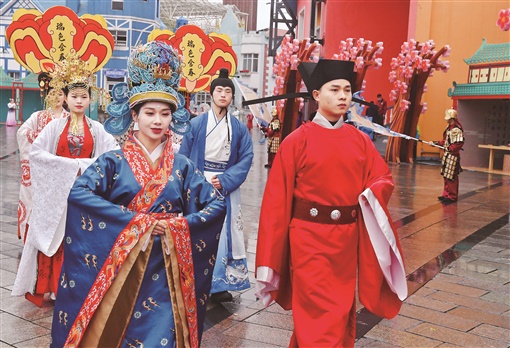4月2日,长沙世界之窗,演员在进行汉服文化巡游展示。当天,“四月汉服季——梦回千年汉服文化盛宴”举行。百人华服大秀、蹴鞠大战、花船巡游、投壶射箭、天外飞仙高空表演等,不仅重现了古人春游盛景,也让游客感受到了华夏民族的汉服魅力。湖南日报·新湖南客户端记者 徐行 通讯员 邓婷 摄影报道