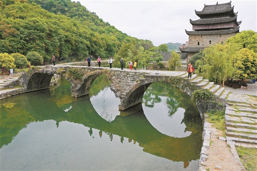 4月6日,江永县下层铺镇上甘棠村,游人从步瀛桥上走过。该村有着1200年历史,至今保存着200多幢明清时期的古民居。近年,该村通过环境整治、保护性开发等措施,留住了乡土古韵,打造成为了生态宜居的美丽乡村。湖南日报·新湖南客户端记者 徐行 摄