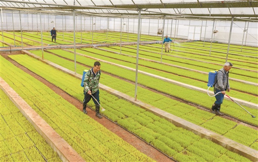 4月6日,东安县紫溪市镇大源村集中育秧大棚内,农户忙着管护秧苗。为稳定粮食生产,该县通过整合土地、技术、劳力等生产要素,推动水稻生产专业化、集中化、规模化。每个乡镇均设有多个早稻集中育秧基地,育苗水平大为提升,有效节约育苗成本。严洁 摄