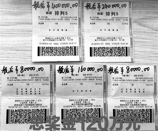 从中奖彩票票面可以看到,这5张彩票第一张是3月25日下午4时多购于湘乡市棋梓镇金鑫商贸城4303007076体彩投注站,对“27996”进行了2倍投注;第二三张是3月25日19:37购于湘乡市桑梅路31号交警大队一号门面4303007074体彩投注站,分别对“27996”进行了5倍、3倍的投注;第四五张是3月25日19:59购于湘乡市新湘路湘乡剧院旁43030473132体彩投注站,分别投注的是号码“26217、28911、27996”和“26217、27996”。