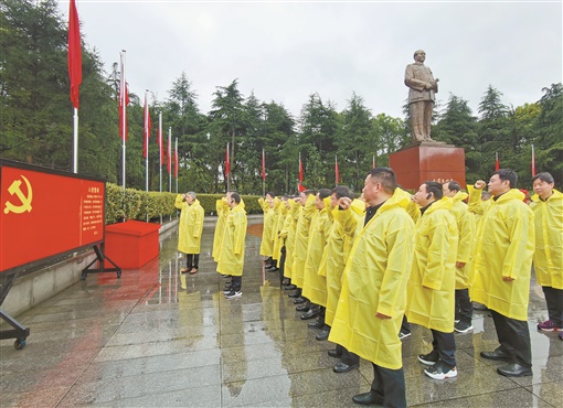 4月7日,韶山市毛泽东铜像广场,学员在重温入党誓词。当天,省委党校94期厅级干部进修班学员来到韶山进行党史学习和革命传统教育。蒙众 摄