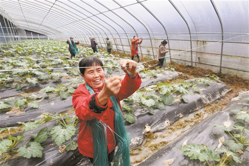 4月8日,龙山县茅坪乡水沙坪现代农业蔬菜直供生产基地,村民给西葫芦吊蔓。该基地是长沙市、济南市市中区对口龙山扶贫协助项目,共流转土地800亩,目前已栽种400亩大棚蔬菜,亩产收益可达2.5万元。 湖南日报·新湖南客户端记者 田超 通讯员 胡域 摄影报道