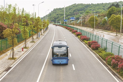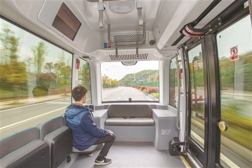 右图:4月9日,国家智能网联汽车(长沙)测试区,安全员乘坐无人驾驶巴士——“阿波龙”。 “阿波龙”是由湖南阿波罗智行联合百度投放的L4级量产无人驾驶巴士,车身长4.3米、宽2米,共8个座位,核载14人,采用纯电动动力。整车没有方向盘、制动踏板、驱动踏板,最高时速40公里,续航里程100公里。