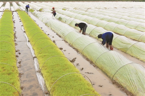 4月10日,澧县澧澹街道邓家滩村集中育秧点,村民给秧苗覆盖薄膜。当天,该县各集中育秧点按照气象部门和农业农村局发布的重大气象专报与早稻秧田应对恶劣天气技术指导意见,及时对秧田进行覆膜护秧处理。柏依朴 摄