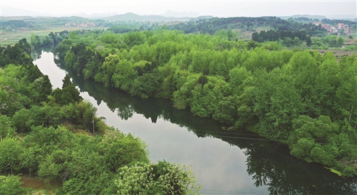 4月11日,新田县大坪塘镇大凤头村舂陵河边,绿树、碧水与远处村庄构成一幅美丽的生态画卷。近年来,该县注重生态环境保护,坚持走绿色发展之路,积极打造“河畅、水清、岸绿、景美”的生态环境。