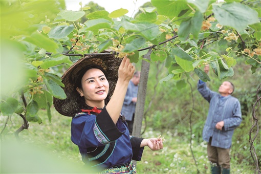 4月12日,麻阳苗族自治县隆家堡乡步云村霞飞云果园猕猴桃基地,果农趁雨停间歇给猕猴桃进行人工授粉。近日,该县5万多亩猕猴桃进入盛花期,果农忙着给猕猴桃进行人工授粉。滕树明 摄