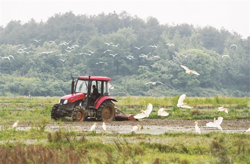 4月11日,道县富塘街道塘背村,农民驾驶拖拉机在翻耕早稻田,翩翩牛背鹭在翻耕后的农田里觅食,时而飞翔,时而驻足,与农机、稻田构成了一幅美丽和谐的生态画卷。近年来,随着该县生态环境的持续优化,引来越来越多的鹭鸟栖息安家。