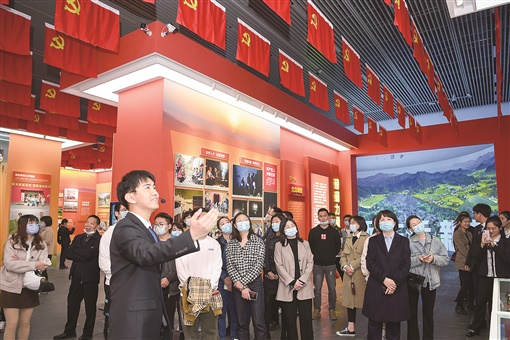 4月15日,湖南省美术馆,市民在听讲解员讲述扶贫英雄王新法的故事。当天是湖南省脱贫攻坚大型成就展开展第二天,前来观看的市民络绎不绝,展览持续火爆。 湖南日报·新湖南客户端记者 傅聪 摄