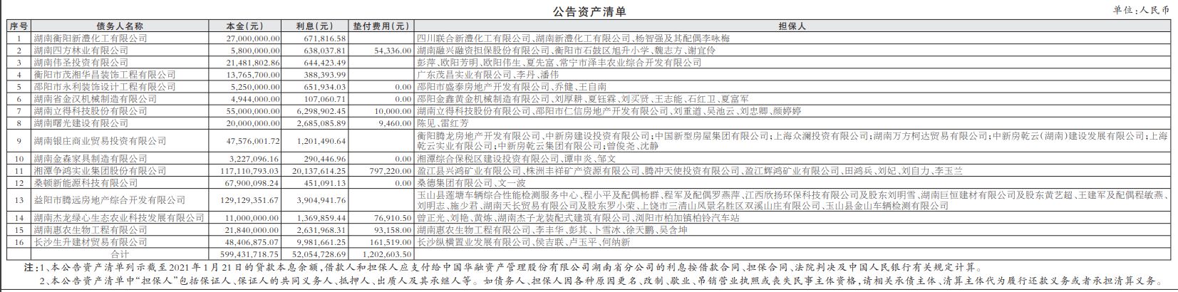 中国华融资产管理股份有限公司湖南省分公司作为上述资产的受让方,现公告要求公告资产清单中所列债务人及其担保人,从公告之日起立即向中国华融资产管理股份有限公司湖南省分公司履行主债权合同、担保合同及相关附属权益文件约定的还本付息义务或相应的担保责任。