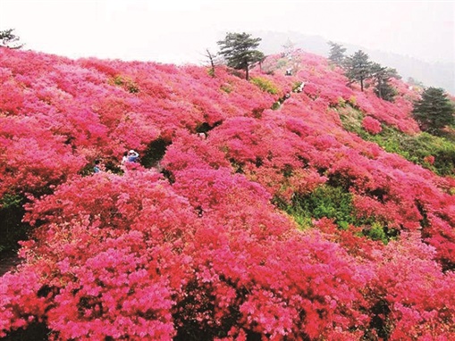 映山红,又叫杜鹃花、山石花。是双子叶植物纲、杜鹃花科、杜鹃属的常绿灌木、落叶灌木。相传,古有杜鹃鸟,日夜哀鸣而咯血,染红遍山的花朵,因而得名。杜鹃花一般春季开花,每簇花2-6朵,花冠漏斗形,有红、淡红、杏红、雪青、白色等,花色繁茂艳丽。生于海拔500至500米的山地疏灌丛或松林下,为中国中南及西南地区典型的酸性土指示植物。