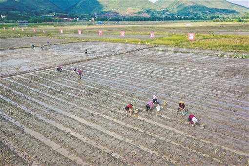 4月22日,蓝山县塔峰镇雷家岭村舜水田园综合体蔬菜基地,村民在移栽香芋苗。近年来,该县因地制宜,积极优化农业产业结构,采取“公司+合作社+农户”模式,规模化种植香芋超两万亩,总产值超亿元,香芋产业已成为当地农民致富增收的特色产业。彭华 摄