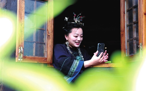 4月20日,吉首市马颈坳镇隘口村,苗族姑娘在进行茶旅网络直播。何嫘 摄 |