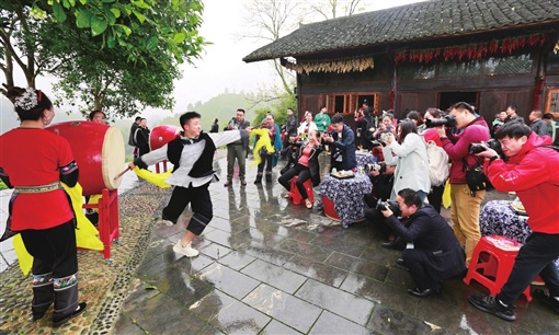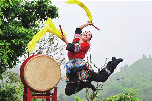 4月20日,吉首市马颈坳镇隘口村,苗族群众欢快地打起苗鼓喜迎游客。罗德盛 摄 |