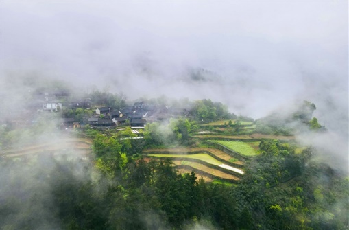 4月20日,吉首市矮寨奇观旅游区吉斗苗寨在云雾中若隐若现,形成一幅大美的山水田园画卷。龙涛 摄 |