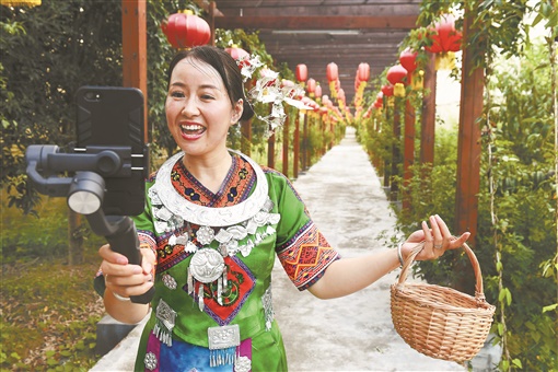 洪江区桂花园乡茅头园村的苗家姑娘熊丽艳,每天准时出现在村里的直播带货基地,通过手机直播,帮助脱贫户销售农产品。