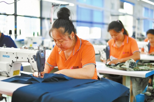 2020年7月24日,工人在湖南十八洞幸安祺服饰有限公司车间内认真缝制服装。目前该公司吸收了建档立卡户和安置点搬迁户34人就业,人均月收入约为2500元。 龙恩泽 摄 |