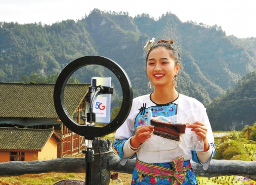 2020年10月24日,十八洞村村民施林娇在使用电信5G网络进行直播,推介当地特产。当年,十八洞村完成5G网络建设。 湖南日报·新湖南客户端记者 傅聪 摄 |