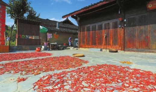 2017年8月20日,十八洞村村民在晒辣椒。 龙爱青 摄