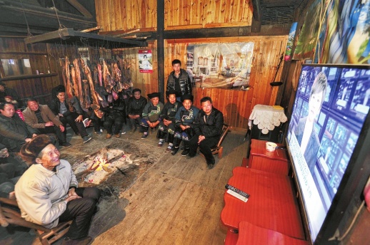 2016年2月16日晚上,十八洞村村民聚在一起收看中央电视台新闻联播头条报道《聚焦十八洞村精准扶贫故事》。 湖南日报·新湖南客户端记者 童迪 摄 |