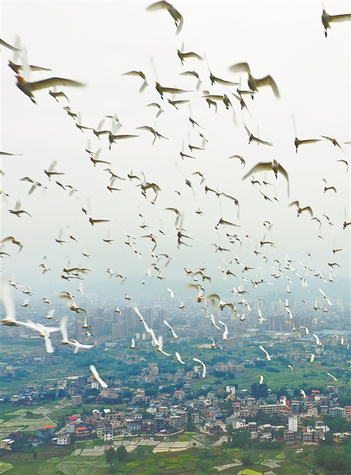 5月6日,嘉禾县珠泉镇钟水河一带,众多鹭鸟盘旋飞翔,十分壮观。近年,该县加大城乡生态环境治理及珍稀鸟类保护力度,生态环境不断改善,吸引了众多鸟类前来栖息安家。黄春涛 摄