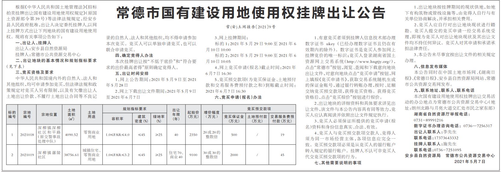 常德市国有建设用地使用权挂牌出让公告