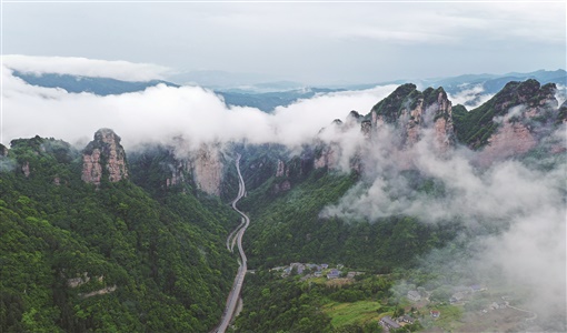 5月10日,雨后的张家界市武陵源区百丈峡云雾缭绕,绿意葱茏,两条旅游公路蜿蜒穿行其间,美如画卷。吴勇兵 摄