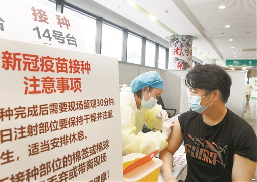 图为5月18日,在上海市徐汇区凯旋南路接种点,护士为市民接种腺病毒载体疫苗。新华社发