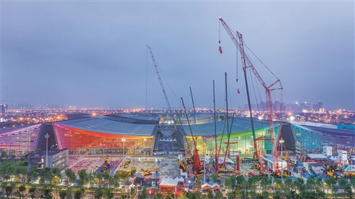 ▲ 5月19日,长沙国际会展中心外的工程机械装备在夜色中流光溢彩。