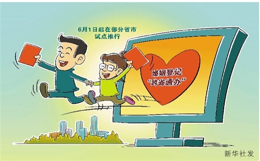 5月19日,民政部宣布,经国务院同意,今年6月1日起,将在辽宁省、山东省、广东省、重庆市、四川省实施内地居民结婚登记和离婚登记“跨省通办”试点,在江苏省、河南省、湖北省武汉市、陕西省西安市实施内地居民结婚登记“跨省通办”试点。试点期限为2年。