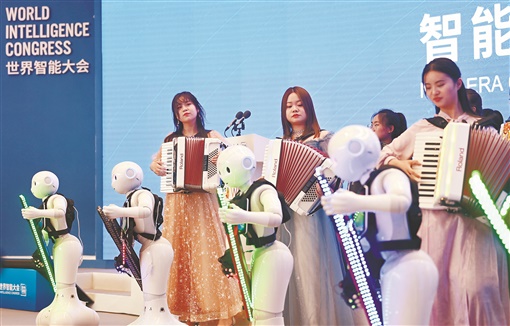 5月20日,第五届世界智能大会在天津开幕,智能科技成果展示令人目不暇接,人工智能等新技术、新产品、新应用层出不穷,全方位呈现了智能科技带来的便利与智能。图为天津梅江会展中心,机器人与乐手合奏音乐。新华社发