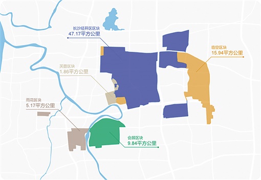 长沙经开区区块重点发展高端装备制造、新一代信息技术、生物医药等产业,着力打造全球高端装备制造业基地。临空区块重点发展生物医药、电子商务、航空物流与保税服务、临空高端商务服务等产业,着力打造高端临空产业集聚区。会展区块重点发展以会议会展产业为主导的现代服务业,打造国际中高端会议会展承办地和高端现代服务业集聚新区。雨花区块重点发展市场采购、驻地综合服务、商贸流通等产业,打造中非经贸深度合作先行区。芙蓉区块着力打造高端现代服务业集聚区、现代农业科技创新引领区、中非经贸深度合作示范区、国际化营商环境标杆区。